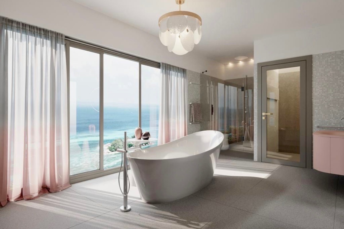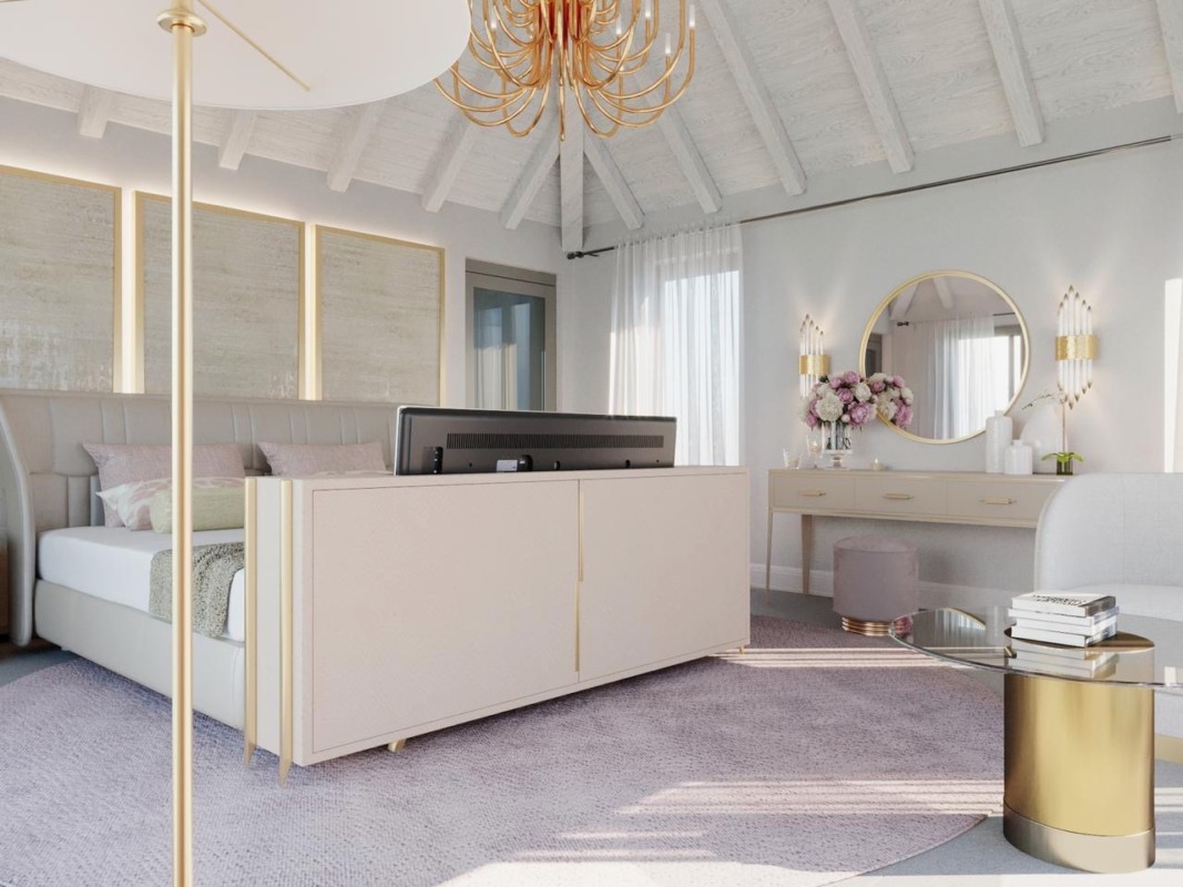 Amazing Sea views from every window in the room , our master bedroom scheme in soothing elegant shades of Ice Cream and Pink with accents of Satin Gold create a restful haven from the Caribbean heat . Up to date features including remote control lift up TV’s and automated curtain poles complete the luxury feel of this room.