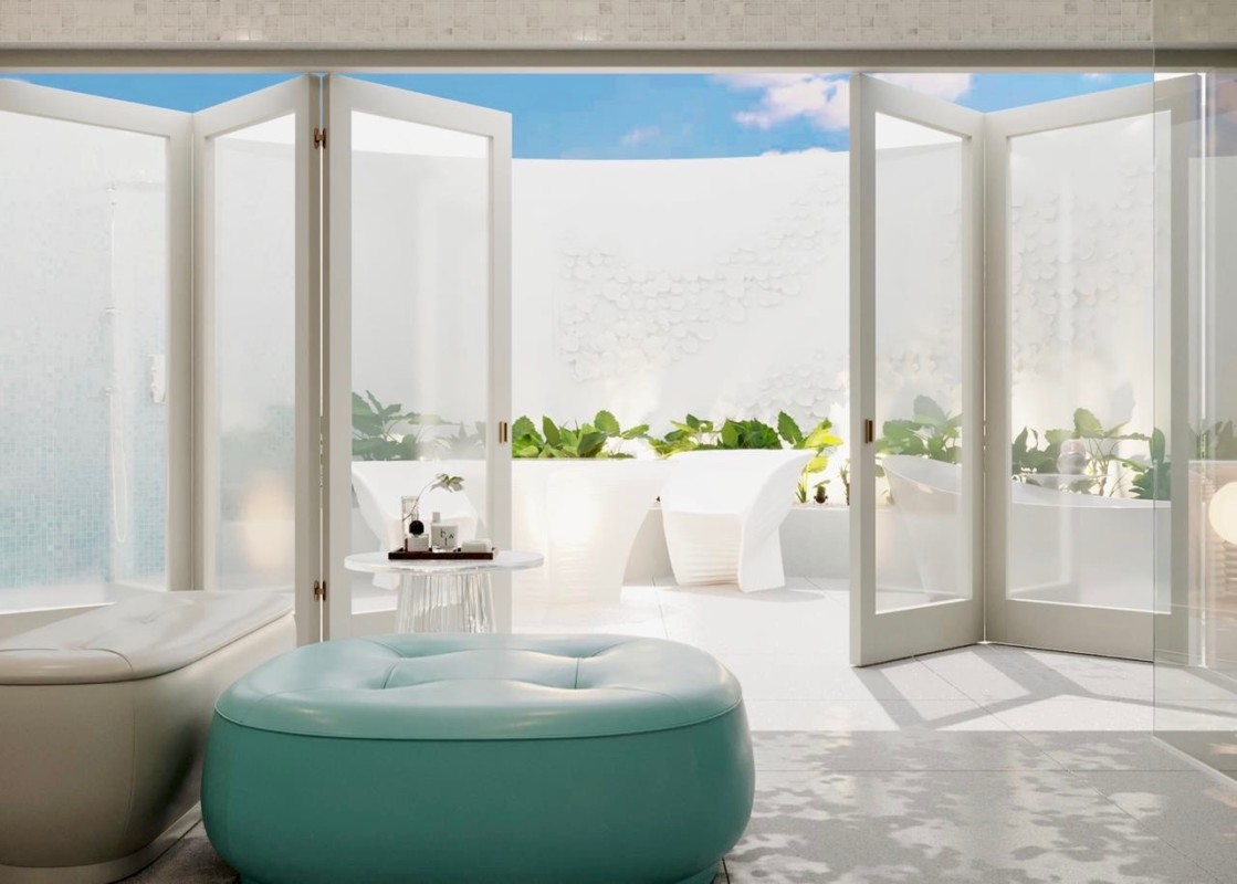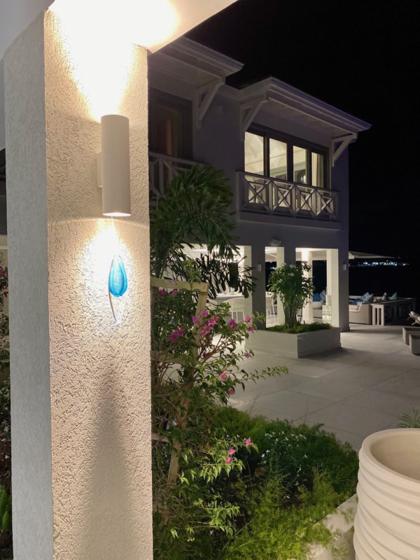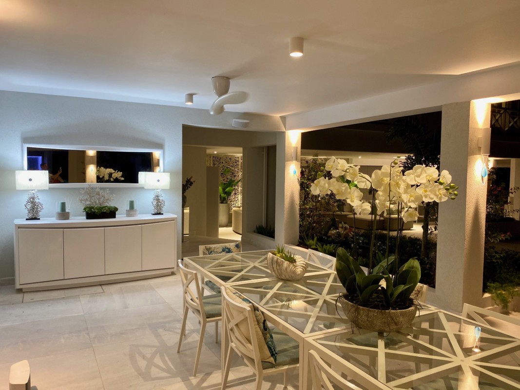 An amazing outside bar from Valcuccini with remote control opening and sit up area overlooking the azure Caribbean sea compliments the huge and comfortable outside seating area with large feature TV and party sound system. With beautiful glass feature lights in watery shades of blue and pale magenta. A dining table for a large gathering with feature sideboard and Coral table lamps all complimented by hand woven outdoor rugs which dry quickly after any Caribbean downpours.