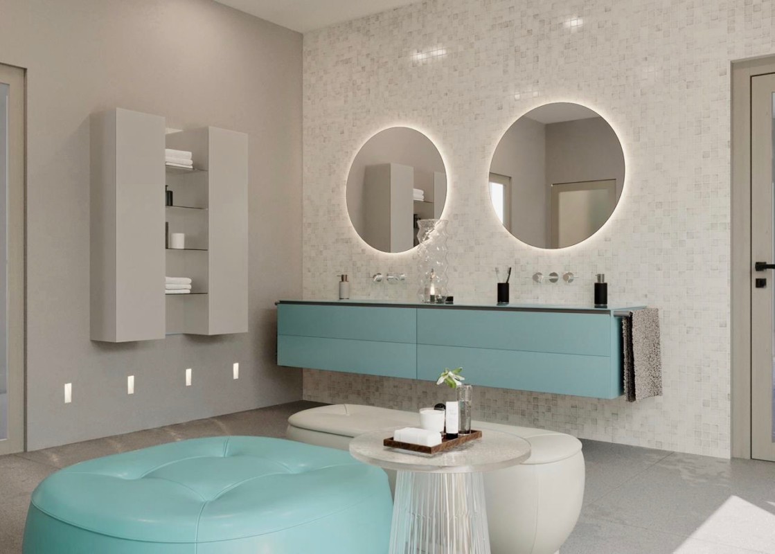 The Armani Silk Wallcovering Headboard panels with Palm leaf design in Pale Blue and yellow was the basis of this design and was complimented with bespoke bedroom furniture and feature lighting from Portugal to create a modern and timeless Guest bedroom design overlooking the beautiful refurbished swimming pool with pearlescent pale blue and pink mosaic tiles.