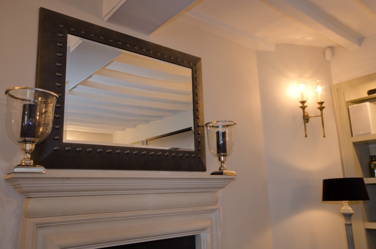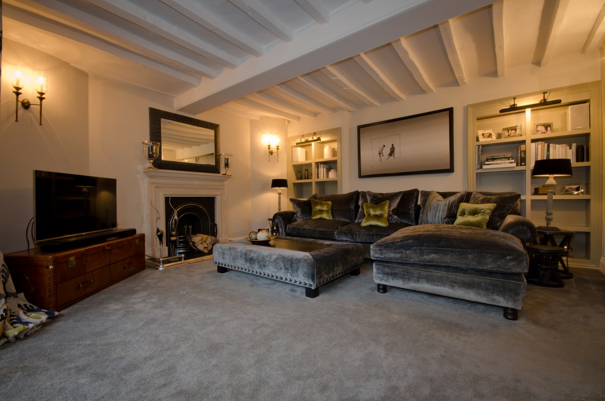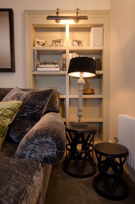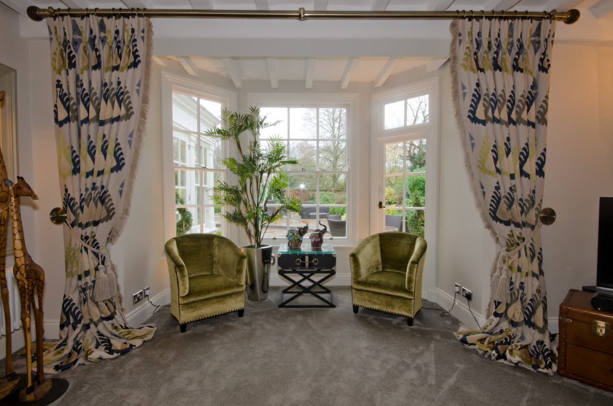 We created a rich and luxurious sitting room whilst maintaining a light and open feel using Zoffany Paints on the ceiling and beams. The Bespoke Sofa is made of Grey Velvet and features stud details to compliment the Eichholtz occasional furniture and lamps. The expertly made interlined curtains feature stylish Ikat design embroidery in slate grey and lime green to add a pop of colour. This Gorgeous Snug in a Georgian Period Home in Staffordshire oozes comfort and classic style